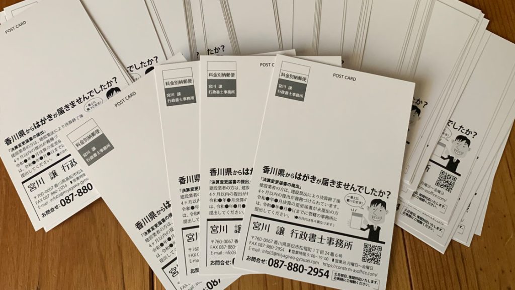 新たに建設業許可を取得された会社様(香川県)に案内ハガキを送付させていただきました。(令和7年3月に更新された「香川県知事許可業者一覧等」より)